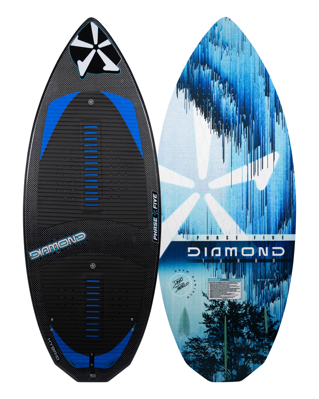 Drew Danielo wanted more pop and speed, and that is exactly what we created with the Phase Five Diamond Turbo Wakesurfer. We enhanced the original Diamond tail shape with a wider, more boxed out design. This upgraded design feature delivers experienced riders the opportunity to go big. The Turbo tail design is also the solution for large riders who need more push and surfers using smaller, less powerful waves. The Diamond Turbo is built using our unique Hybrid Carbon™ material for ultimate strength. We configured the Diamond Turbo with a three fin setup installed with our 1” Skim Fin (2” on the 57”) in the center accompanied by 1” Fakie Skim fins on the outside.